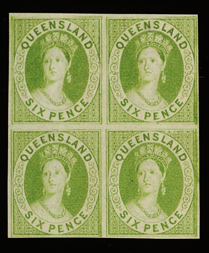 1185 ngbl 48a image#48a, 1876-78 6p Apple green imperforate, a brilliant unused block of four, luxuriant color on crisp white paper, large margins all round, extremely fine (S.G. #92a; £300). (Image) Est. 200-300