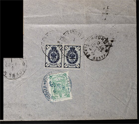 1187 c imageRussian Zemstvo Perm (Perm Government) 2k Bluish green and Imperial 7k Dark blue (#50),horizontal pair, both on reverse of 1902 (Jan. 2) registered envelope (creased or folded in places clear of adhesives) from Perm to Moscow (arrival c.d.s.), cancelled by their respective c.d.s., an appealing combination cover between the rural and Imperial postal administrations. (Image) Est. 150-200