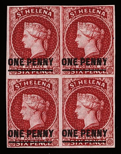 1188 ogbl 8 image#8, 1863 "ONE PENNY" surcharge 17mm on 6p Brown red, very scarce and seldom seen mint block of four, intense color, large even margins, o.g., extremely fine (S.G. #3; £440+). (Image) 440.00+