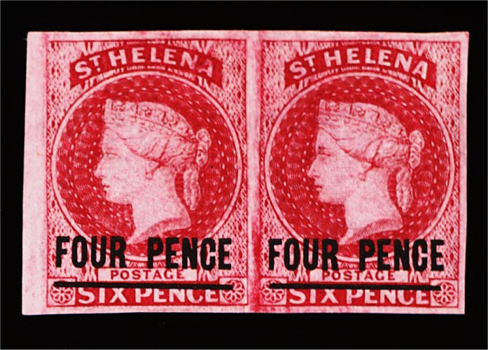 1189 og 10 image#10, 1863 "FOUR PENCE" surcharge on 6p Carmine imperforate, very scarce horizontal pair from the left of the sheet, vivid color, large even margins, o.g., extremely fine; the first such pair of this imperforate we have seen (S.G. #5; £1,000+). (Image) 1,000.00+