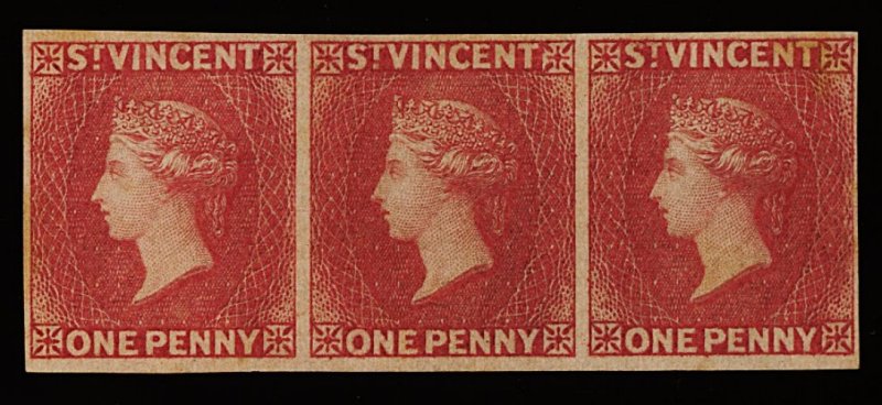 1193 ng 1a image#1a, 1861 1p Rose red, imperforate, scarce horizontal strip of three, unused, without gum as is often the case, ample to large margins all around, deep rich color, very fine (S.G. #1b; 375+). (Image) 525.00+