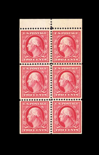 1341 nhBP 332a image#332a, 2c Carmine booklet pane of six, position E, with guide line between first two rows, outstanding centering, bright color, fresh and intact, o.g., n.h., extremely fine; a gem pane; 2001 PF certificate. (Image) 250.00