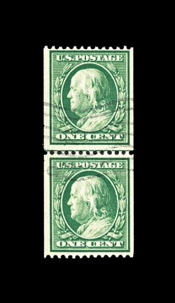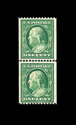1346 O 348 image#348, 1c Green coil, perf. 12 horiz., very scarce used guide line pair, well centered, bright color, very light central strike of a wavy line machine pmk., very fine; used line pairs of this coil are seldom offered; 1993 PSE and 2003 PF certificates. (Image) 550.00