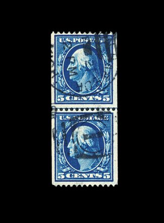1354 O 355 image#355, 5c Blue coil, perf. 12 vert., used pair, exceptionally well centered, fresh color on bright white paper, lightly cancelled, extremely fine; genuine used pairs are quite difficult to come by, with this pair being one of the nicest quality used examples we have seen; 2003 PF certificate. (Image) 550.00