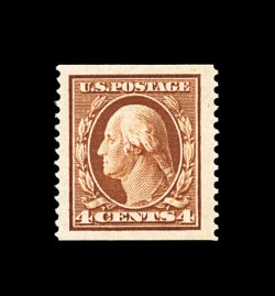 1353 nh 354 image#354, 4c Orange brown coil, perf. 12 vert., a visually stunning mint example of this coil, possessing the most immense margins imaginable for any stamp, let alone this typically tightly margined coil, outstanding centering amid these impressive margins, sumptuously rich color and impression, o.g., n.h., extremely fine; a fabulous gem; 2003 PF certificate. (Image) 450.00