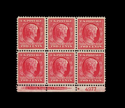 1358 nhPB 369 image#369, 2c Lincoln on bluish paper, bottom margin imprint, small star and plate no. 4977 block of six, incredibly well centered throughout the plate block, with each stamp featuring unusually wide margins, deep luxuriant color, o.g., n.h., bottom right stamp with light pencil notation on gum, extremely fine; certainly one of the best centered examples of this rare plate block we have ever encountered; 1993 PF certificate; ex-"Southern Cross" collection. (Image) 4,400.00