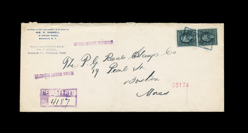 1403 EDU 430 image#430, 7c Black, well centered vertical pair tied to legal size registered cover to Boston, Mass. by boxed "Norwalk, Conn." handstamp, two strikes of violet double circle "Norwalk, Conn./Jun 19, 1915/Registered" postmarks on reverse, this being the earliest documented usage of Scott #430, Boston, Mass. receiving c.d.s. also on reverse, cover with some opening irregularities at top, overall very fine; a desirable and rare Washington-Franklin earliest documented usage; 2002 APS certificate. (Image) Est. 750-1,000