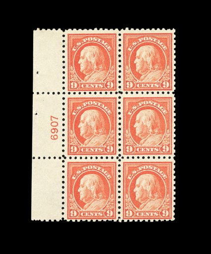 1404 ogPB 432 image#432, 9c Salmon red, left margin plate no. 6907 block of six, fresh color, o.g., fine-very fine; 2000 PSE certificate. (Image) 700.00