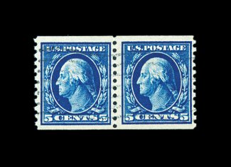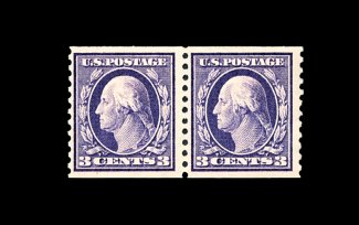 1412 og 445 image#445, 3c Violet flat plate coil, perf. 10 vert., exceptionally fresh pair of this scarcer coil, with intense deep violet color, o.g., barest trace of hinging in the left stamp only if at all, very fine. (Image) 575.00