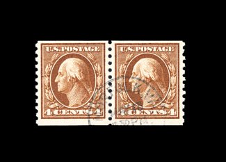 1413 O 446 image#446, 4c Brown flat plate coil, perf. 10 vert., used pair, rich fresh color, nicely centered, light c.d.s. postmark, very fine; 1996 PSE and 2001 PF certificates. (Image) 325.00
