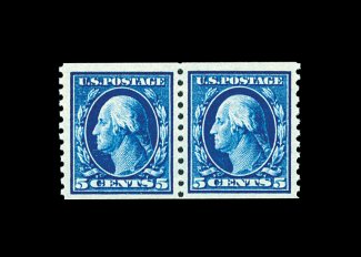 1414 nh 447 image#447, 5c Blue flat plate coil, perf. 10 vert., pair, deeply rich color on brilliant white paper, well centered and margined, o.g., n.h., choice very fine; 1999 PF certificate for a strip of three, this being the right pair. (Image) 230.00