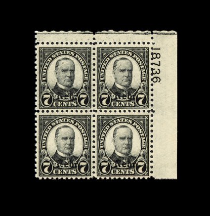1482 nhPB 676 image#676, 7c "Nebr." ovpt., top right corner margin plate no. 18736 block of four, particularly fresh and crisp, with intensely rich color, far better centered than usual, o.g., n.h., choice very fine; a handsome plate block. (Image) 400.00