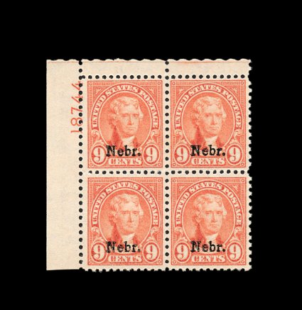 1485 ogPB 679 image#679, 10c "Nebr." ovpt., top right corner plate no. 19235 block of four, nicely centered, strong color, o.g., lightly hinged, small mark on top right stamp, otherwise very fine. (Image) 950.00