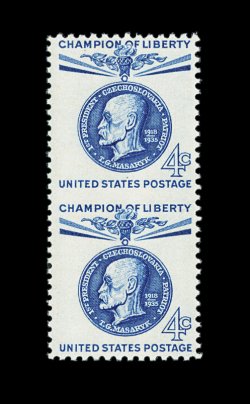 1490 nh 1147a image#1147a, 4c Masaryk, vertical pair, imperforate horizontally, choice mint example of this rare and seldom offered error, being one of only ten pairs recorded and the first example we have ever offered in our auctions, well centered, o.g., n.h., very fine; photocopy of a 1973 APS certificate for a block of four, this being the right pair, plus a 1991 PF certificate as a pair. (Image) 3,250.00