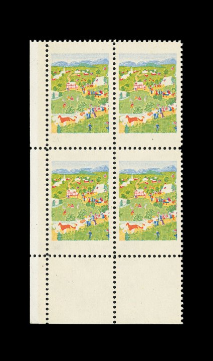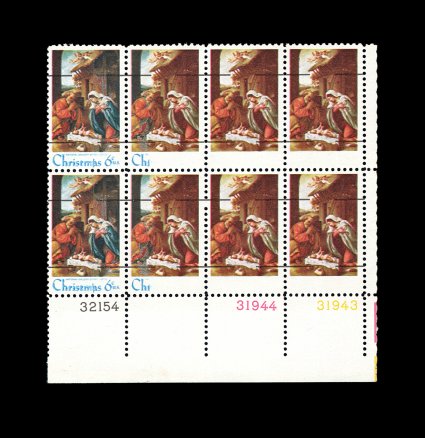 1493 nhPB 1414c image#1414c, 6c Christmas, blue omitted, transitional bottom right corner plate number block of eight, with the four right stamps completely missing the blue color, while the first vertical pair is normal, and the second vertical pair has the blue partially omitted, with pre-cancel bars as always, well centered, o.g., n.h., very fine; an extraordinarily rare color omitted error, as only 15 examples are reported, with this being the unique plate block containing four such errors; 1993 PF certificate. (Image) as four singles 6,000.00+