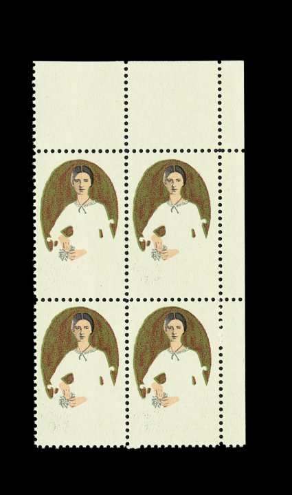 1494 nhPB 1436a image#1436a, 8c Emily Dickinson, black and light olive green omitted, top right corner plate number block of four (with plate number omitted), very well centered, o.g., n.h., extremely fine; a striking and scarce color omitted error, with only three error plate blocks thought to exist; 1989 and 1991 PF certificates. (Image) as four singles 3,000.00+