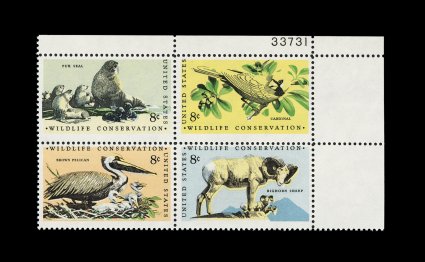 1497 nhPB 1467d image#1467d, 8c Wildlife Conservation se-tenant block of four, red and brown omitted, a very rare top right corner plate number block example of this very rare and striking missing color error, o.g., n.h., fine-very fine; only sixteen such se-tenant blocks exist, with this being the only plate block known to us; 1992 PF certificate. (Image) as normal block 3,000.00+