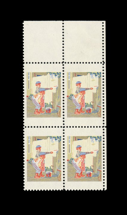 1498 nhbl 1470b image#1470b, 8c Tom Sawyer, red and black omitted, top right corner sheet-margin block of four of this visually striking and rare missing color error, quite well centered, o.g., n.h., very fine. (Image) as four singles 6,800.00+