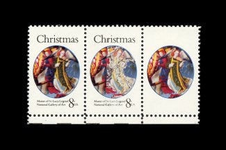 1499 og 1471b image#1471b, 8c Christmas, black omitted, a highly desirable transitional bottom sheet-margin horizontal strip of three, the first stamp being normal, the second with black partially omitted, and the third stamp is the error, o.g., lightly hinged, extremely fine; an exceptionally rare modern error, as only ten are thought to exist; 1992 PF certificate. (Image) 4,000.00+