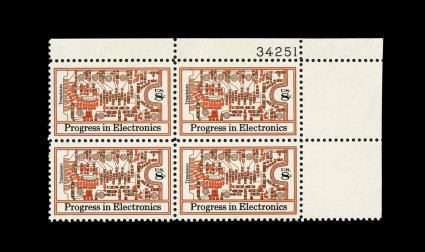 1500 nhPB 1501b image#1501b, 8c Electronics, tan and lilac omitted, top right corner sheet-margin plate no. 34251 containing four error stamps, being the unique plate block from the only known sheet of 50 errors, excellent centering, slightly disturbed o.g. as found on several examples of this error, n.h., choice very fine; 1996 PF certificate. (Image) as four singles 5,000.00+