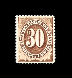 1582 ng J13 image#J13, 30c Deep brown special printing, an incredibly choice unused example of this postage due rarity, without gum as is so often the case with the Special Printings, however this stamp is far above the norm as it is completely free of any of the faults which plague most known copies, plus it is remarkably well centered, strong distinctive color, extremely fine; with only 179 issued (and fewer surviving) this is one of the finest available; 1971 and 1999 PF certificates. (Image) 4,500.00