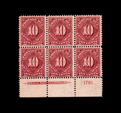 1593 ogPB J42 image#J42, 10c Deep claret, bottom margin imprint and plate no. 1781 block of six, strong color, o.g., lightly hinged, fine-very fine. (Image) 750.00