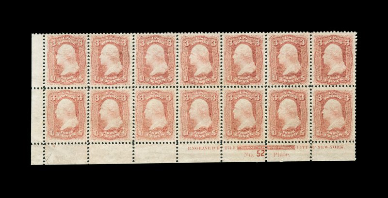 1065 nhPB 65 #65, 3c Rose, an absolutely superb bottom left corner sheet-margin imprint and plate "No. 52" block of fourteen (7x2), in a quality that is almost unimaginable for any multiple from this period, let alone a rare plate number block, possessing true "post office" freshness and crispness, with rich luxuriant color and a well incised impression, the centering throughout the multiple is quite remarkable, with nearly every stamp being virtually perfectly centered, pristine o.g., never hinged, there are a couple of sensibly rejoined perf. separations in the bottom right margin barely worth mentioning, extremely fine; unquestionably the finest plate block of Scott #65 known; 1992 PF certificate; ex-Anderson. (Image) for hinged 5,150.00+