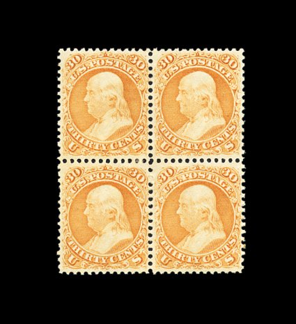 1071 ogbl 71 image#71, 30c Orange, a magnificent quality mint block of four of this rare and difficult stamp, possessing extraordinary physical attributes, among which is its overall brilliance and crispness, with absolutely radiant color and a sharp impression, beautifully centered (especially when one considers how tightly spaced this particular value is found), full clean o.g., lightly hinged, very fine-extremely fine; in all likelihood the finest quality multiple in existence, and the top right stamp in this block is easily the finest 1861 Thirty Cent Orange we can imagine; 1976 and 1992 PF certificates; ex-DuPuy and Anderson. (Image) 8,250.00