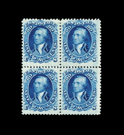 1074 ogbl 72 image#72, 90c Blue, an enormously rare mint block of four of this elusive and challenging high value, extraordinarily bright and fresh, with strikingly intense color and a well incised impression, crisp and intact, centered just a bit to top left, full clean o.g., lightly hinged, a fine and handsome example of this 19th century mint multiple rarity; our research suggests that this block is in the finest available quality of the no more than four or five that still remain intact; 1993 PF certificate; ex-Caspary, Lilly and Ishikawa. (Image) 26,000.00