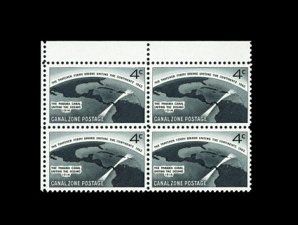 1788 nh 157a image#157a, 4c Black, Thatcher Ferry Bridge omitted, position 18, a superb mint example of this, one of the most famous printing errors in philately, flawlessly centered within large margins, brilliantly fresh, o.g., n.h., an extremely fine gem; one full sheet of 200 (which was cut into four panes of 50) was inadvertently printed without the silver bridge, only one of these panes of 50 ever made it into the public's hands, in this case the famous stamp dealer H.E. Harris, who successfully sued the Canal Zone Postal Administration preventing them from deliberately printing tens of thousands of similar errors (much like the famous U.S. Dag Hammaeskjold error), of the three panes that never made it into the public's hands, one pane of 50 each were laminated and donated to the Smithsonian Institution and the Canal Zone government, while the third pane was destroyed, leaving 50 stamps for the collecting public; this is position 18 (as indicated by a small light pencil position number on the reverse of the stamp) and is accompanied by a 1992 PF certificate. (Image) 7,500.00