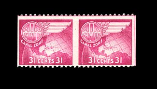 1791 og C25a image#C25a, 31c Cerise, imperforate vertically, horizontal pair with guide line at right, bright color, nicely centered for this, o.g., lightly hinged, left stamp with natural gum crease, still very fine; only 98 pairs were produced; ex-Plass. (Image) 1,000.00