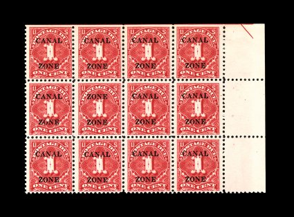 1796 og/nhbl J18a image#J18a, 1c Carmine rose, "Zone Zone" error, top right corner margin block of twelve, with part arrow in selvage, position 18 being the error stamp, rich color, full clean o.g., error stamp and some others never hinged, some perf. separation, a very fine and handsome showpiece; only fifteen examples have been recorded. (Image) 1,250.00+
