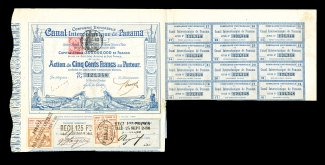 1800 imageCanal Zone bonds, 66 bonds from 1886-1904, all written in French with "Campagnie Universelle Canal Interoceanique de Panama" at top, about a dozen are the smaller sized blue bonds (see photo), others are mostly the larger sized red bonds, many with French or special "Canal Interoceanique de Panama" revenue stamps tied, various other handstamp markings also applied, condition a little mixed as expected; an unusually large group of these interesting collateral items. (Image) Est. 1,000-1,500