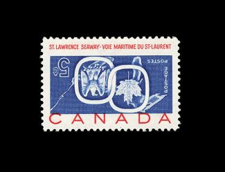 2063 nh 387a image#387a, 1959 5c St. Lawrence Seaway, Center Inverted, a gem mint example of this popular rarity, flawlessly centered amid very large margins, brilliantly fresh, pristine o.g. that has never been hinged and is completely free of the gum problems so prevalent on most existing copies, extremely fine; one of the finest never hinged examples extant; 1991 PF certificate; ex-"Samos" collection (Unitrade C$15,000.00). (Image) 7,500.00