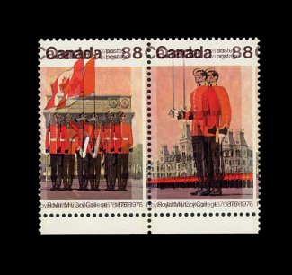 2064 nh 693a image#693d, 8c Royal Military College, se-tenant pair, double impression, select bottom sheet-margin mint example of this very rare error, quite fresh, o.g., n.h., very fine; one of the most important and spectacular of all the modern errors of Canada; 1993 PF certificate; ex-"Southern Cross" collection (Unitrade C$5,000.00). (Image) 3,000.00