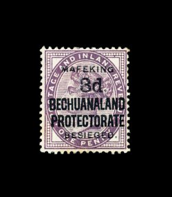 2067 og 173 image#173, 1900 "Mafeking/3d./Besieged." surcharge on 1p Lilac, mint single with rich deep lilac color, o.g., normal slight pink paper adherence from the blotting paper that was used to separate the sheets, very fine and scarcer value; clear 1973 RPS certificate (S.G. #12; £900). (Image) 900.00