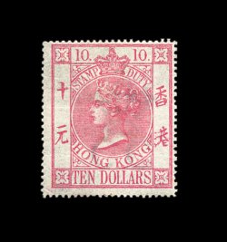 2112 ng 59 image#59, 1892 $10.00 Gray green, an extraordinarily impressive unused example of this major Hong Kong rarity, exceedingly well centered, showing wide even margins on bright white paper, and surrounded by full even perforations, very pleasing pastel color with clear detailed impression, extremely fine; an incredibly rare postal fiscal that is rare in any condition, but particularly so this choice; 1978 RPS certificate (S.G. #F6; £11,000). (Image) 11,500.00