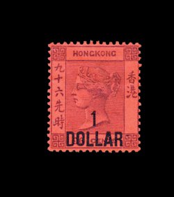2111 og 56 image#56, 1891 "1/Dollar" surcharge on 96c Violet on red, a fresh and beautiful mint single, unusually well centered, strong violet color on bright red paper, o.g., very fine and choice example of this high value (S.G. #47; £750). (Image) 750.00