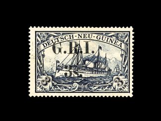 2161 og 14 image#14, 1914 "G.R.I./3S." surcharge on 3M Blackish violet, narrow 4mm spacing, fresh and attractive single with sharp and detailed surcharge, well centered, o.g., lightly hinged, very fine; it is believed that no more than 48 of this value of German New Guinea were surcharged of the combined both spacings; signed Hoffmann Giesecke and H. Bloch, and accompanied by a 1996 BPA certificate (S.G. #14; £3,250). (Image) 3,500.00