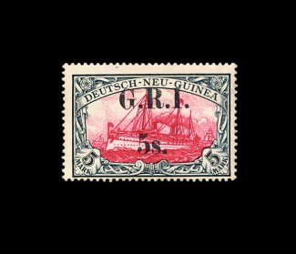 2162 og 15 image#15, 1914 "G.R.I./5S." surcharge on 5M Slate and carmine, narrow 4mm spacing, lovely mint example of this rare and beautiful high value, gorgeous rich colors, quite well centered, clean o.g. that has been lightly hinged, accompanying certificate states there is a "small vertical crease at top", which is nothing more than a trivial gum wrinkle in our opinion, very fine: it is believed that no more than a mere 35 stamps of German New Guinea were surcharged of the combined both spacings; 1991 PF certificate; ex-Gibralter (S.G. #15; £6,500). (Image) 6,000.00