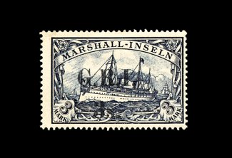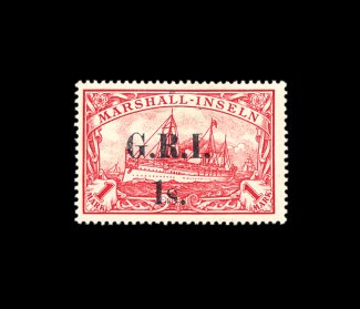2163 og 28 image#28, 1914 "G.R.I./2S." surcharge on 2M Blue, wide 5 1/2mm spacing (setting 2, position 3), exceptionally well centered mint single, sumptuously deep color and sharp impression, slightly disturbed o.g., extremely fine; it is believed that no more than 75 stamps of German New Guinea were surcharged of the combined both spacings; double signed Champion and Kilian BPP, accompanied by the latter's 1985 certificate; ex-Gibralter (S.G. #28; £2,750). (Image) 2,500.00