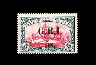 2164 og 29C image#29C, 1914 "G.R.I./5S." surcharge on 5M Slate and carmine, wide 5 1/2mm spacing, mint example of this incredibly rare high value, disturbed part o.g., particularly intense deep colors, centered to the bottom right and fine; this stamp is so rare that it is seldom available in any condition, it is believed that no more than 35 of this value of German New Guinea were surcharged for the combined two spacings, and the rarity of this spacing compared to the narrow spacing implies that it was much less than half of those; signed Bothe BPP and accompanied by a 1990 Holcombe certificate (S.G. #30; £17,000). (Image) 25,000.00