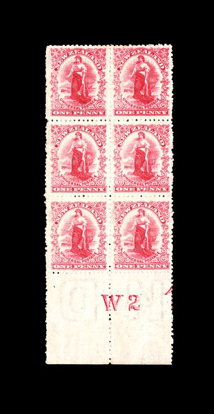 2172 ogbl S.G. #352 S.G. #352, 1906 1p Deep rose carmine, perf. 14, Waterlow Bros. & Layton trial plates, two bottom sheet-margin blocks of six (2x3) with "W1" and "W2" inscriptions respectively designating the plates made by Waterlow, fresh with strong bright color and a sharp impression that shows the plate characteristics well, o.g., hinged in top pair and selvage leaving the bottom block of four n.h., very fine-extremely fine; these plates were made specially to test plate wear compared to a similar pair of plates by W.R. Royle & Son, catalog value is for just hinged singles, much more desirable and scarce with the inscriptions to identify them, excellent for exhibition (Scott #108 var.). (Image) S.G. £300+