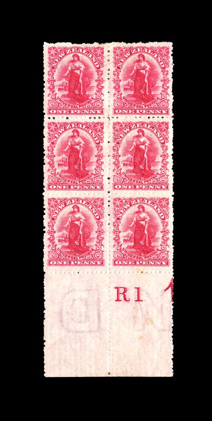 2173 ogbl S.G. #356 S.G. #352, 1906 1p Deep rose carmine, perf. 14, W.R. Royle & Son trial plates, two bottom sheet-margin blocks of six (2x3) with "R1" and "R2" inscriptions respectively designating the plates made y Royle, fresh with strong bright color and a sharp impression that shows the plate characteristics well, o.g., one pair n.h. in each block, very fine-extremely fine; these plates were made specially to test plate wear compared to a similar pair of plates by Waterlow Bros. & Layton, catalog value is for just hinged singles, much more desirable and scarce with the inscriptions to identify them, excellent for exhibition (Scott #108 var.). (Image) S.G. £120+