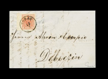 2306 c 3 var. image#3 var., 1850 3kr Red, hand-made paper, Ty. IIIa, Tokay roulette, a magnificent left sheet-margin single, possessing full and well chiseled roulettes all around including vertical roulettes between the stamp and a full 5mm of additional sheet margin at left, most amazing is that the stamp itself is virtually perfectly centered within these wide even margins and full roulettes, a phenomenon that is seldom found on any value of these rare roulettes, unusually fresh with bright clear color and a sharp detailed impression, neatly and attractively tied to clean 1853 folded cover by complete and clear "Tokay/12 5" c.d.s., posted to Debreczin where backstamped the next day, an extremely fine gem; this provisional method of separation is one of the earliest of any country, originating in the Hungarian towns of Homonna and Tokay by the postmasters of those towns, very few covers are known with these issues and the vast majority are single frankings; though the 3kr is the most "common" of this decidedly rare issue, the condition of this cover is a rarity in itself, possessing sheet-margin, centering and overall attractiveness that would be hard to improve upon; among the finest if not the finest known example of this rarity available; signed Friedl and accompanied by 2001 Ferchenbauer certificate describing this as a select "Prachtstueck"; ex-Gelber and Ujlaki (Ferchenbauer #3, €12,500+). (Image) Est. 10,000-15,000
