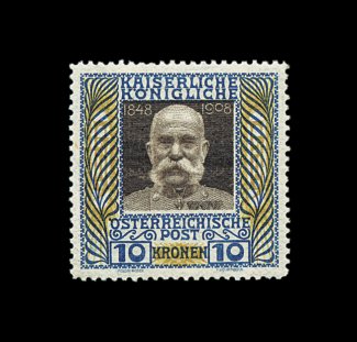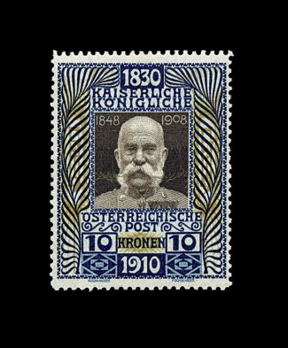 2307 nh 110-27 image#110-27, 1908-13 1h-10K Franz Joseph cplt., an especially fresh and choice set, generally well centered, o.g., n.h., very fine (Michel #139-56). (Image) 560.00