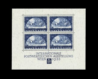 2314 og B111 image#B111, 1933 50g WIPA souvenir sheet of four, pristine mint example of this scarce and popular souvenir sheet, remarkably fresh and clean on both the front and back, full o.g., faint trace of hinging at top as always, this was where the sheet was hinged into the presentation booklet, extremely fine; original presentation booklet also accompanies (Michel Block #1; €4,000). (Image) 2,000.00