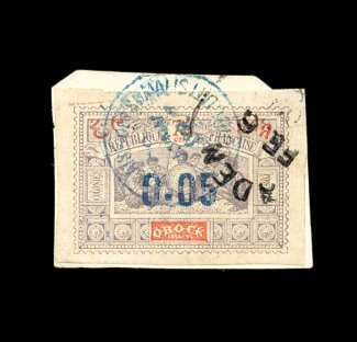 2523 O 27B image#27B, 1902 "0.05" Surcharge on 75c Gray lilac and orange, large even margins all around, tied to piece by blue c.d.s. postmark, also a portion of an Aden transit marking, very fine and truly scarce; 1992 Rendon certificate (Yvert #34; FF 8,000). (Image) 800.00