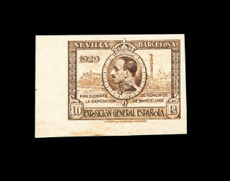 2524 nh 345-57, E2 vars. image#345-57, E2 vars., 1929 1c-10P Seville and Barcelona Exhibitions imperforate cplt. including the special delivery stamp, all are sheet-margin examples, bright and fresh, o.g., n.h., some have light natural gum bends as is often found on these (stronger gum crease on the 15c value), choice very fine; an attractive set that is not easy to find imperforate; (Michel #408U-21U; €1,100). (Image) for hinged 1,050.00