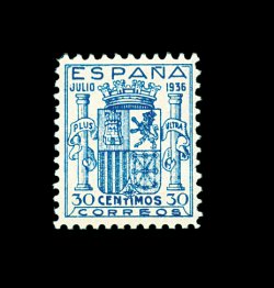 2529 nh 617 image#617, 1936 30c Dark blue Arms of Spain, exceptionally fresh mint example, strong rich colors, unblemished o.g., never hinged, very fine; genuine example of this stamp are quite underrated, as most of those offered are actually forgeries (Michel #750; €750). (Image) 625.00